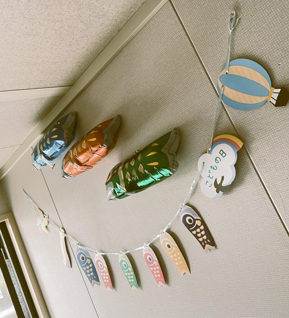 今月は定番の鯉のぼりです!まるで空を悠々と泳いでいるかの様な良い飾りつけですね!